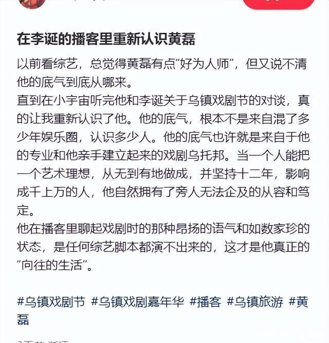 好友李诞也在自己的博客里发声力挺黄磊,倒不是帮他挽尊说节目《向往》不差,但他把黄磊对戏剧的理想、情怀说得透透的,有网友从他的说辞里重新认识了黄磊,也觉得之前对他存在很多误会。